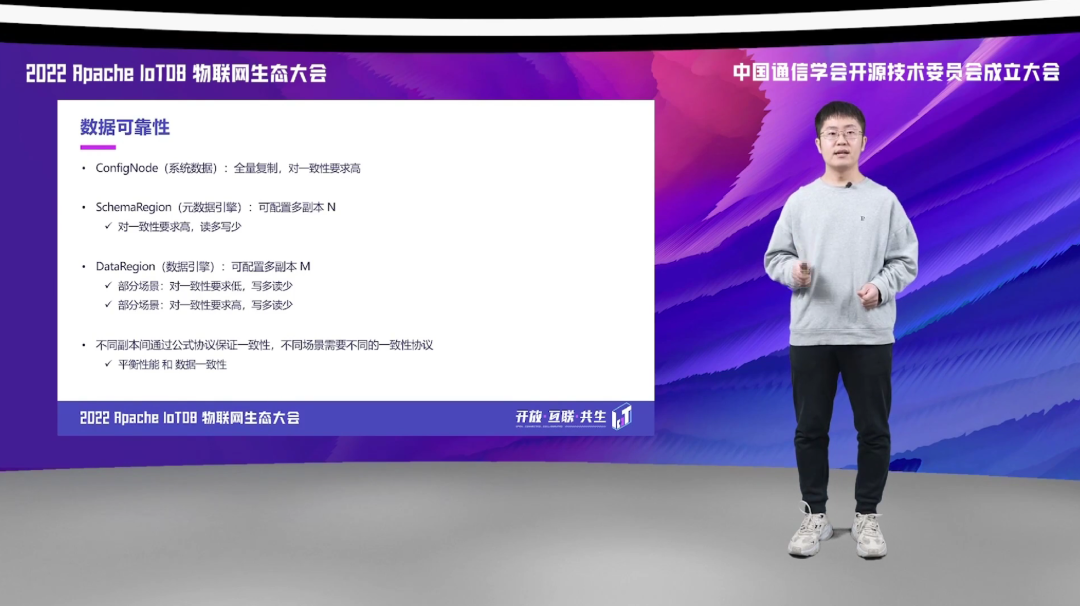 刚刚讲完了元数据分区通过 SchemaRegion、数据分区通过 DataRegion 来保证高可用性,但实际上我们对于 Region的配置是非常灵活的,我们可以根据需要,选择不同的一致性的协议与副本数。对于 ConfigNode,它的一致性要求是非常高的,所以我们一般是采用强一致性的协议,在复制的时候要采用全量复制进行复制。对于元数据分区的 SchemaRegion,它对一致性的要求也比较高,一般会配置强一致性的一个协议。而对于数据 DataRegion,IoTDB 提供了强一致性与弱一致性两种不同的协议,用户可以在平衡性能与一致性的需求之后,选择最适合自己的一个协议。