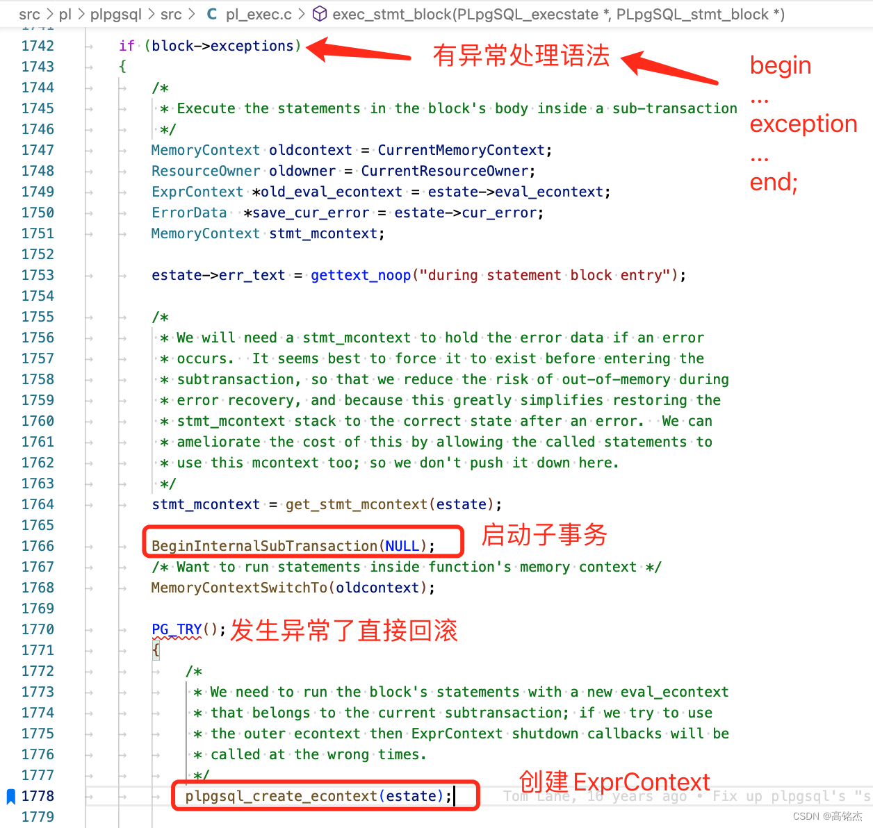 }所以如果没有发生异常,那么eval_econtext会跟着ReleaseCurrentSubTransaction在子事务提交中释放。