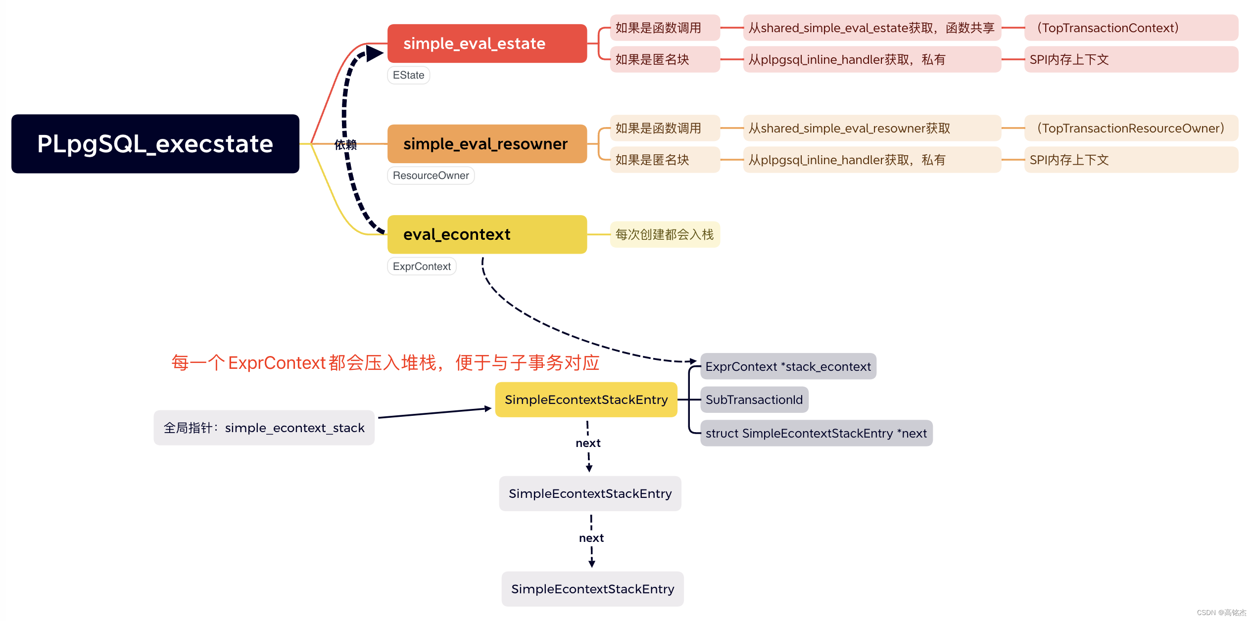 所以PLpgSQL_execstate中会包含EState *simple_eval_estate;、ExprContext *eval_econtext;结构。