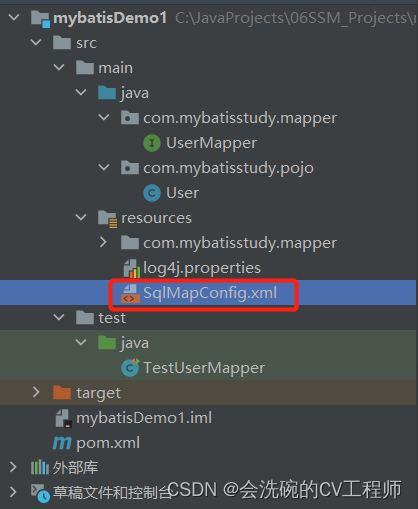 Mybatis核心配置文件在resources资源目录下(如下图),其中主要核心是连接数据库的参数配置