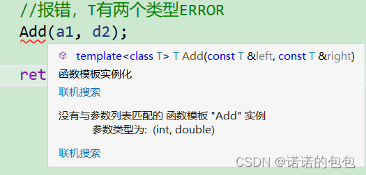 但是,假如我们这里Add(a1,d2),此时就会报错,因为编译器根据a1的类型推演T的类型为int,但是由于d2的类型为double,所以编译器推演T的类型为double,而一个T怎么可能会有两个类型,所以会报错(编译器也很懵逼,这个T到底是int,还是double???)