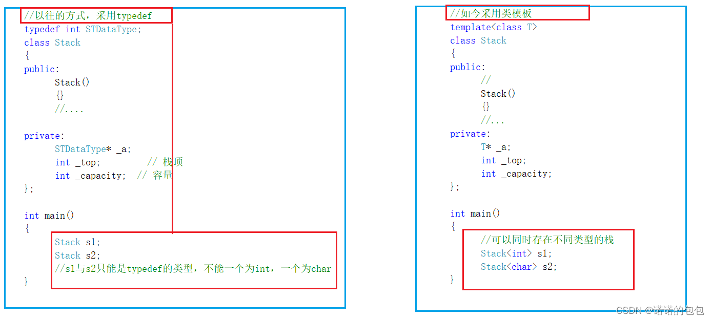 这样的话,假如我们想要更换成char类型,直接在typedef处修改即可,不过这样有一个缺陷,就是我们无法同时定义一个char类型与int类型的栈。而类模板的存在则可以解决这个问题。