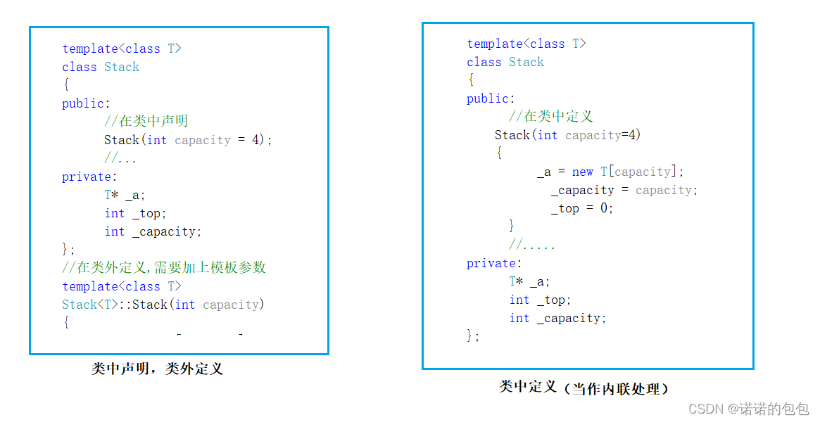 在类中声明,在类外定义,定义时需要加上模板参数列表。或者直接在类中定义(类中的成员函数会被当做内联函数处理,提高效率)
