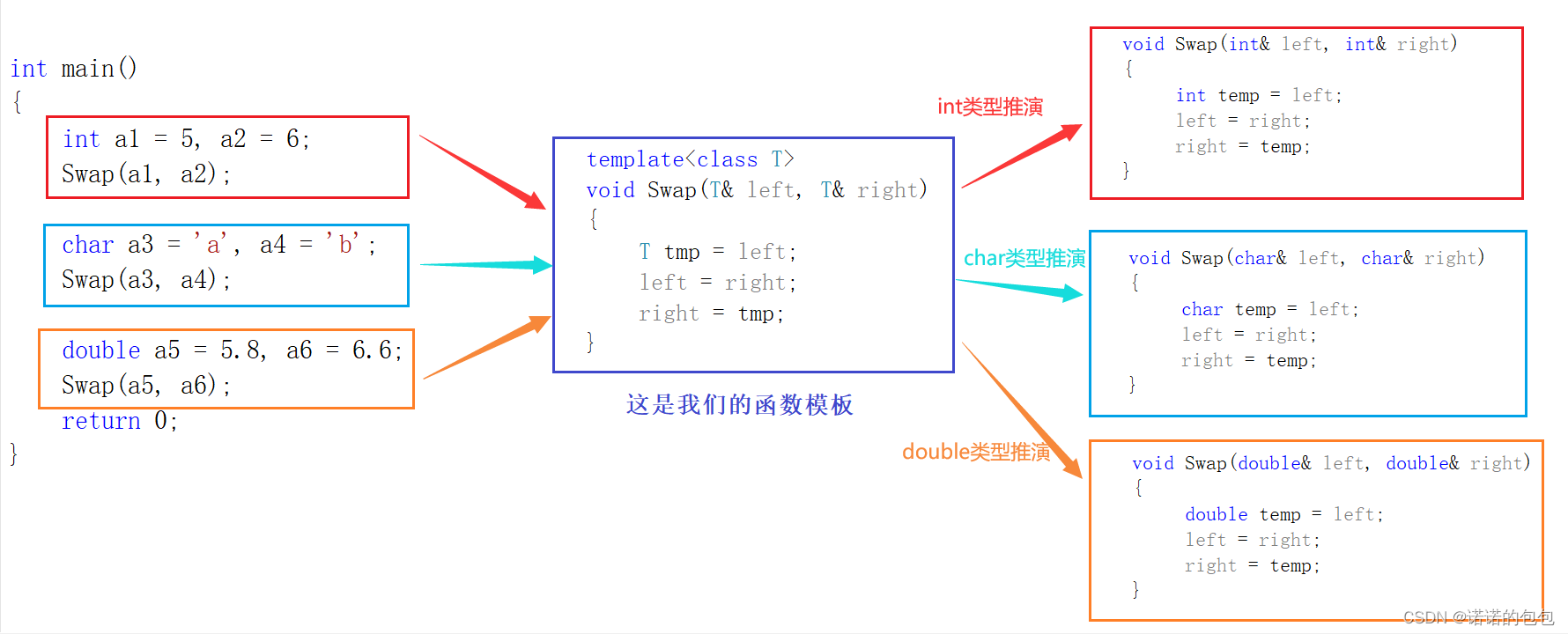 }但是,我们发现这个工作很繁琐,并且复用率低(假如出现新类型,还要再手动写)。在这种情况下,我们可以通过函数模板,来实现我们的目的。
