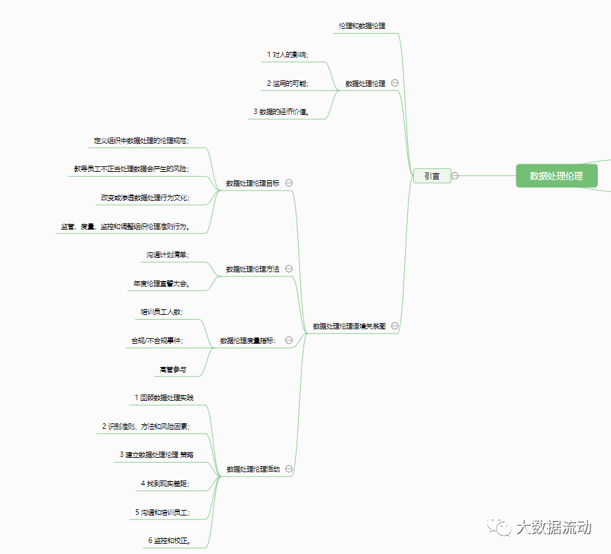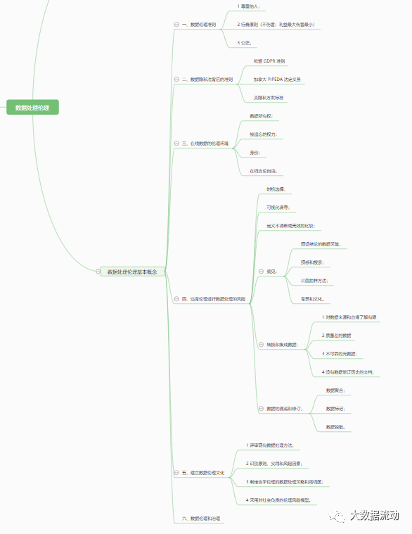 本文档为数据处理伦理章节部分学习笔记,思维导图与知识点整理。共分为4个部分,由于页面显示原因,部分层级未能全部展开。结构如下图所示。