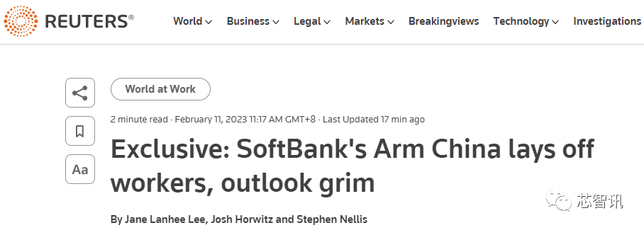 2月11日消息,据路透社援引三位熟知内情的消息人士爆料称,日本软银集团旗下的半导体IP技术厂商——英国Arm公司的中国合资企业——安谋科技(又称Arm中国)上周裁员了90-95人,以应对今年充满挑战的业务前景与情况。