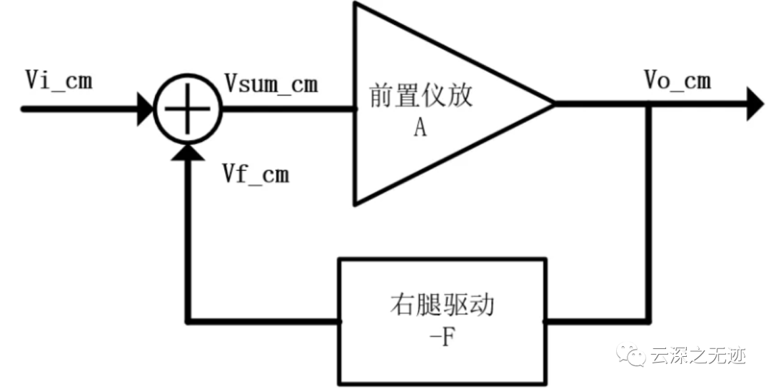 右腿驱动电路可以简化为下面框图,Vi_cm是输入的共模电压,Vf_cm是反馈回来的电压,Vsum_cm是输入和反馈求和后的电压,Vo_cm是输出的电压,前置仪表放大器对于共模信号而言放大倍数A=1,右腿驱动电路的放大倍数大约几十倍,是反向比例放大。