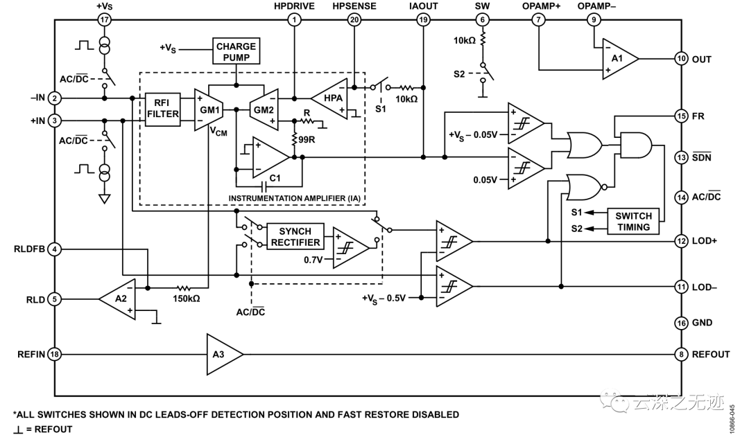 右腿驱动(RLD)放大器使仪表放大器输入端上的共模信号反相。当右腿驱动输出电流注入对象时,它会抵消共模电压变化,从而改善系统的共模抑制性能。