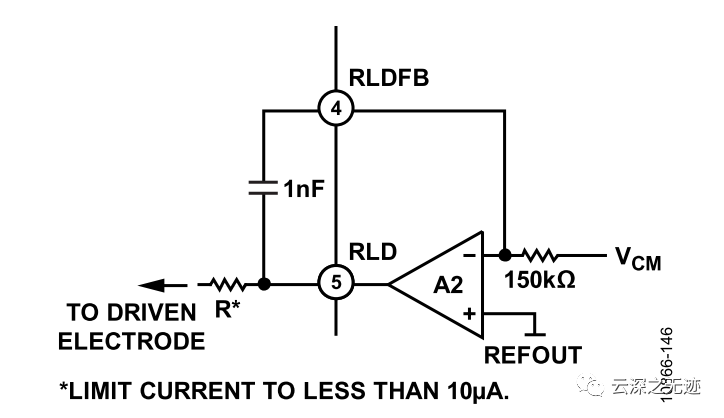 在双电极配置中,可使用RLD通过10 MΩ电阻偏置输入,如“导联脱落检测”部分所述。若未使用RLD,则建议通过直接连接RLDFB至RLD,将A2配置为跟随器。