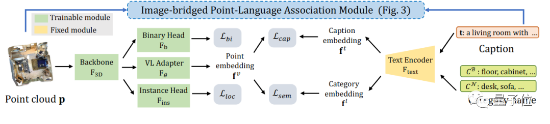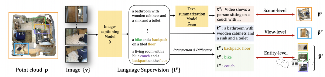 紧接着,利⽤图⽚和点云之间的投影关系,图⽚的语言描述也就自然能够关联到3D点云数据了。