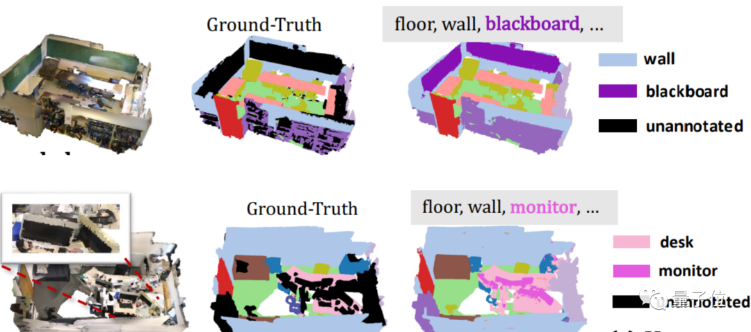 比如看下面这个例子,未标注的(unannotated)黑板和显示器,3D模型经过这个方法训练之后,就能很快“抓准”目标进行划分。