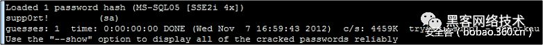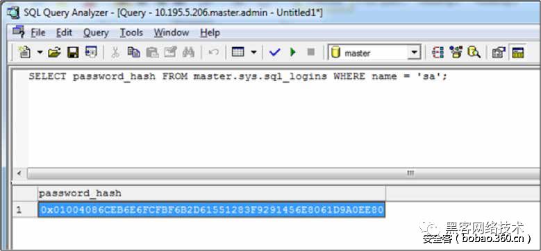 SELECT password FROM master.dbo.sysxlogins WHERE name = ‘sa’;拿到hash后可以用 John the Ripper 来破解.