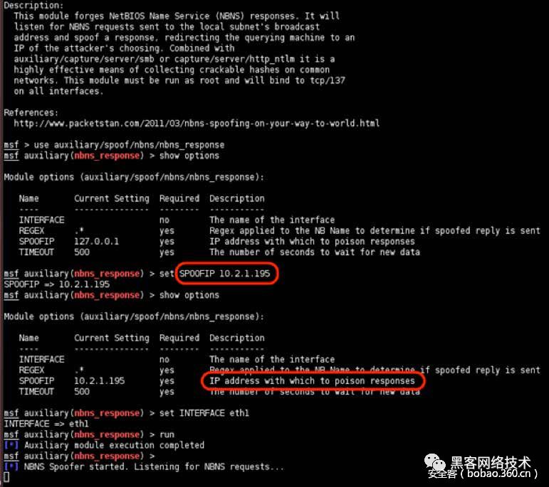 通过设置 SPOOFIP 为攻击者攻击机的地址,然后再配合metasploit中抓取hash的模块比如auxiliary/server/capture/smb 和 auxiliary/server/capture/http_ntlm.我们就可以抓到ntlm hash 然后破解他.