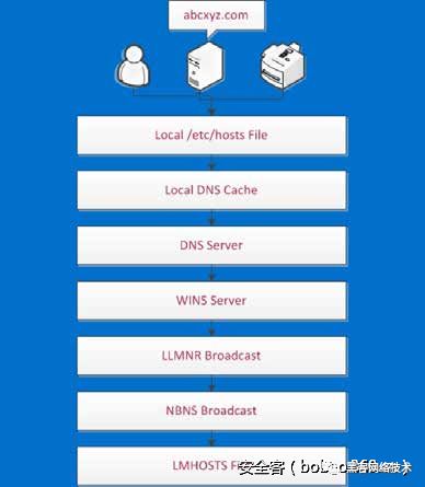 在Windows XP 和 Windows Server 2003中默认会使用 LM hash.此外在高版本的windows中windows也会将每个已经的用户的 LM hash存储到内存中.攻击者可以通过利用在 windows域中缺乏认证的 名称解析 来抓取网络中传输的LM hash.如果有一个对 abcxyz.com 的资源请求,下面的图片展示了一个 windows查找资源的的一个顺序关系.
