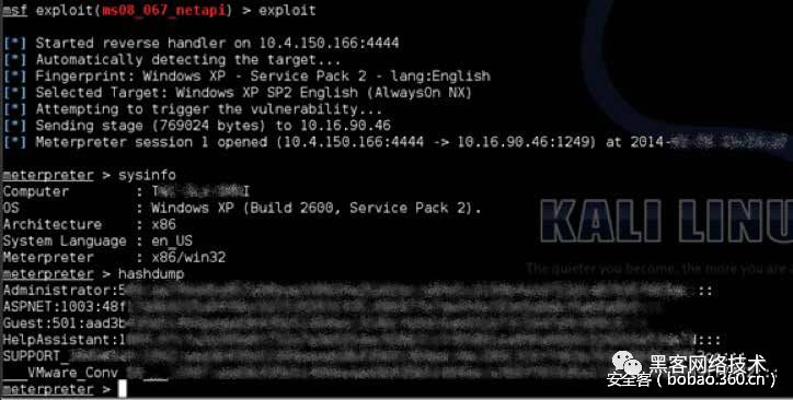 第二个就是大名鼎鼎的 Metasploit,首先使用nmap对网络进行扫描,之后导入扫描结果到 Metasploit中,然后结合经验,测试一些 exploit来实现攻击.比如使用 ms08-067 来进行攻击