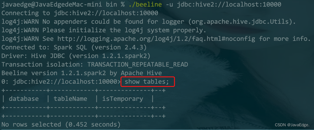javaedge@JavaEdgedeMac-mini bin % ./beeline -u jdbc:hive2://localhost:10000