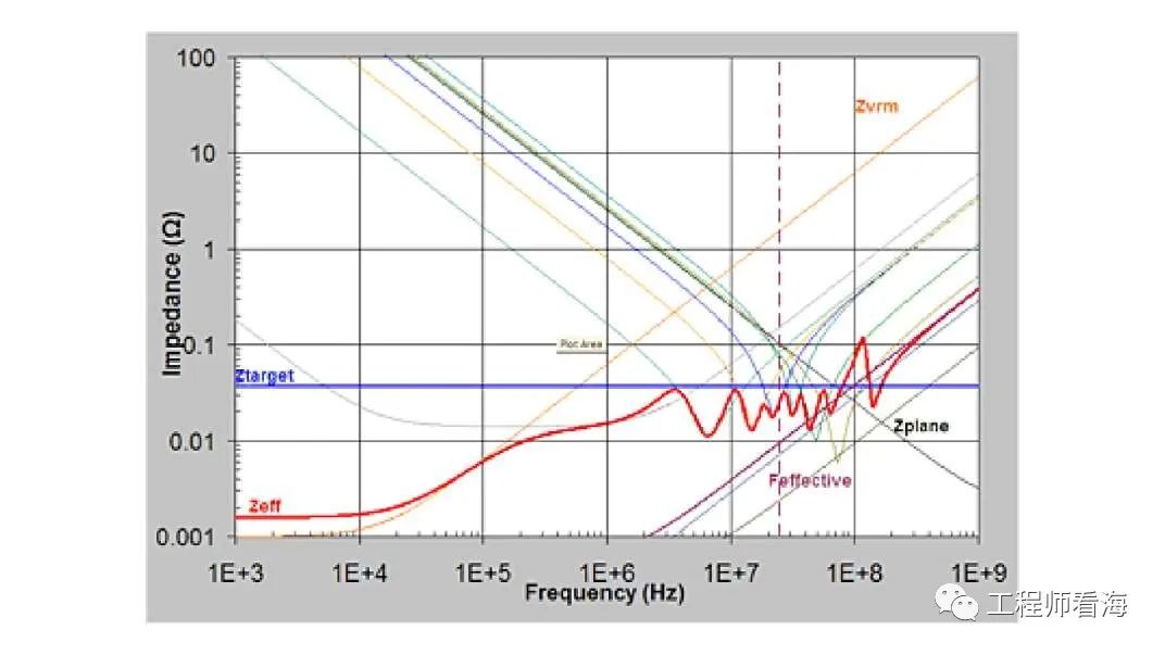 比如上图就是阻抗频率曲线,如果负载工作频率单一,只以一个固定的频率工作,假设工作电流是一个单一频率的正弦电流,那么阻抗优化就变的简单了,只要这个频率的阻抗低于目标阻抗就行,但是实际情况很复杂,我们不知道复杂的具体工作频率,所以为了保险起见,我们控制的是一定频段内的阻抗,而不是直流或单一频率的阻抗,这看起来是一种过设计,但是确实非常安全的设计。蓝色曲线就是我们的目标阻抗,我们要做的就是优化这一频段内PDN阻抗(Feffective频率内),使得实际红色阻抗在负载要求的频带内低于目标蓝色阻抗。