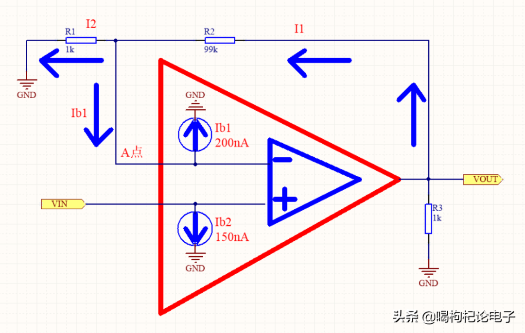 当忽略运放的偏置电流时,即不考虑Ib1时,I1=I2,A点电压VA=VIN。
