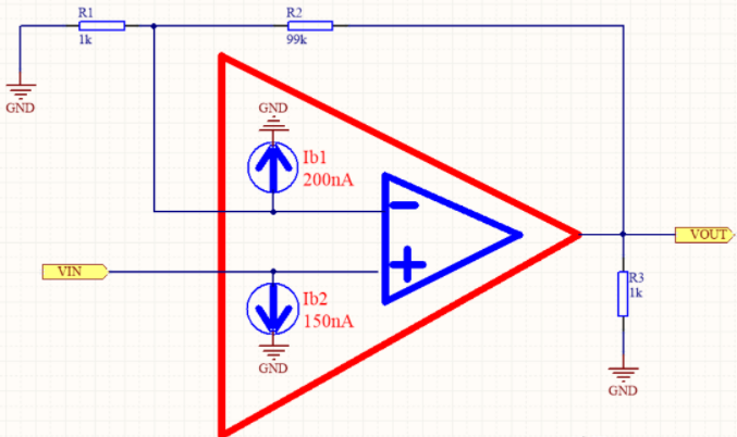 上图运放蓝色部分我们将它看成一个理想运放,红色部分是现实中的运放,Ib1和Ib2分别是反相和同相端的偏置电流,参见下图。