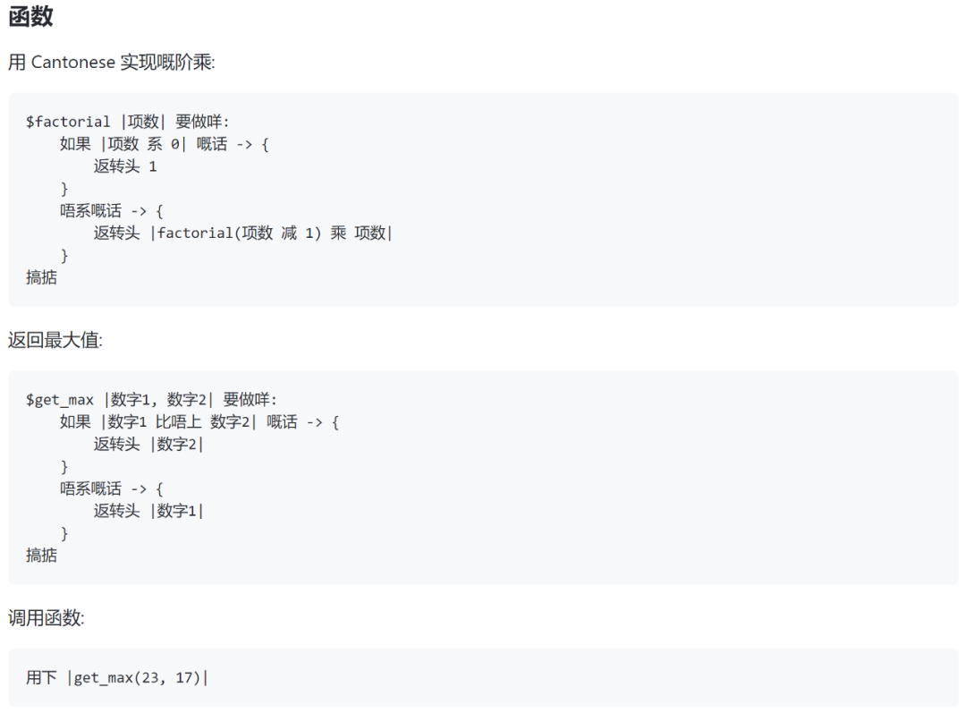 下面列举了粤语版「Hello World」以及一些基本的功能(循环、函数等),还涵盖了面向对象编程和堆栈使用的示例。当然,还有各种有趣的编程语法细节,比如用「搞掂」来结束函数,用「使下」来调用库。
