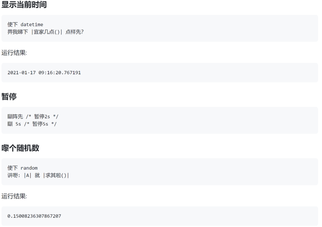 项目作者在《5 分钟学会粤语编程》教程中解释说,这里的「畀 (bei)」在粤语中是「给」的意思,「睇」是「看」的意思,所以整条语句的意思是「让我看看」的意思,而后面的「点样先?」则表示委婉的语气,意为「怎么样?」。对于这种有意思的互动,作者解释说,「需要用委婉语气来给计算机留下第一个好的印象,否则计算机可能会离家出走呢,对吧?」