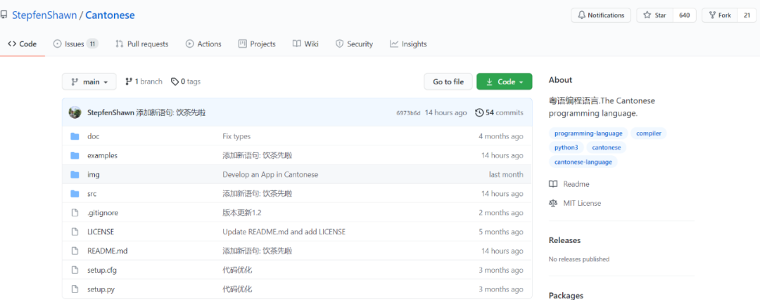 那么,今天我们就给大家介绍一个有趣的粤语编程语言 GitHub 项目,其开发者 Stepfen Shawn 似乎(自称)是来自广州的十六岁高中生。目前,该项目的 star 量已经达到了 600+。虽然工作中不会用粤语写代码,但是空闲时玩一下粤语编程,难道不是件乐事吗?