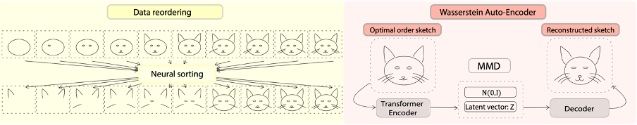 在第二阶段,Pixelor 根据上述经过最佳笔画顺序更新的数据集,来训练序列到序列的草图生成模型。不同于之前 SketchRNN 模型的是,研究人员提出用最佳传输距离 (optimal transport) 替代基于KL散度的方式(常见于变量自编码器中)来约束嵌入特征空间。这种设计选择是基于对人类手绘行为的直观观察。面对同一个视觉概念,虽然不同的个体可能在你画我猜游戏中展现相似的竞技性,但他们仍然会有不同的草图策略。这使得笔画序列空间本质上是多模态分布的,而最佳传输距离可以更好地捕捉这种分布。