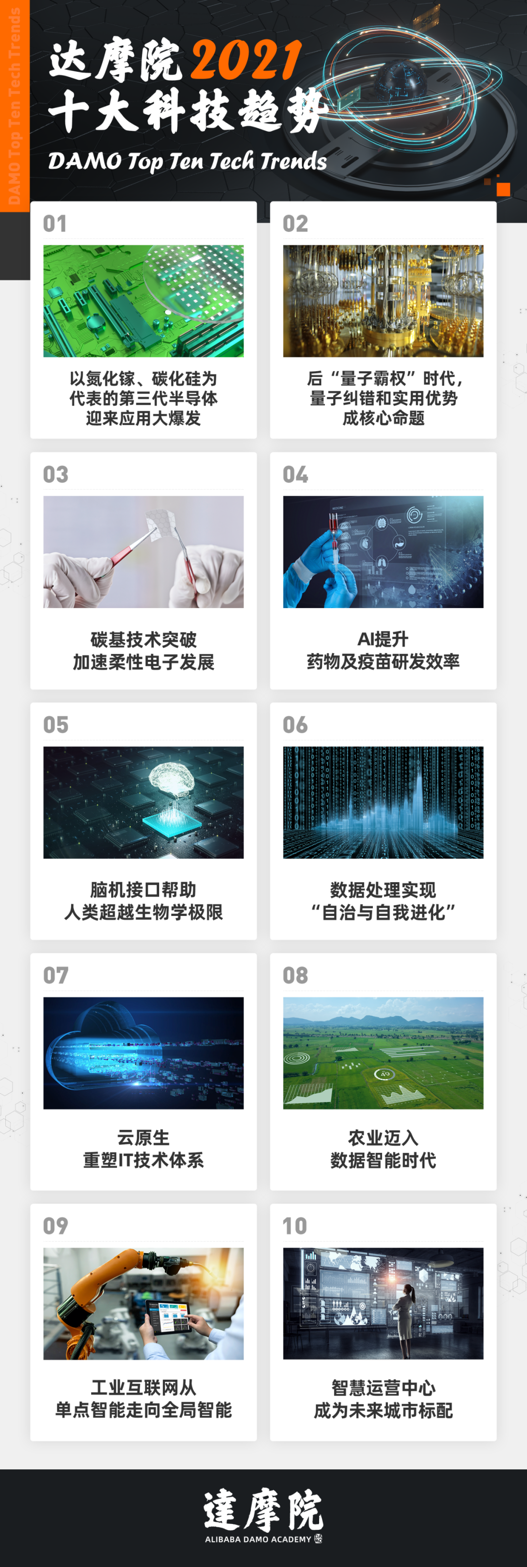 一年一度的达摩院十大科技趋势预测如期而至,围绕基础科学、前沿应用、场景革新三个方面,阿里巴巴达摩院发布了 2021 年十大科技趋势,复盘不平凡的 2020 年,预判被疫情倒逼和重塑的技术未来。