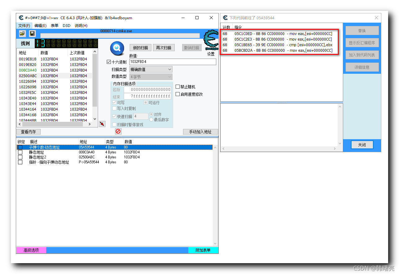 此时 , 可以查询 , 哪些汇编指令 , 访问了 子弹数据的 动态地址 05A59544 ;
