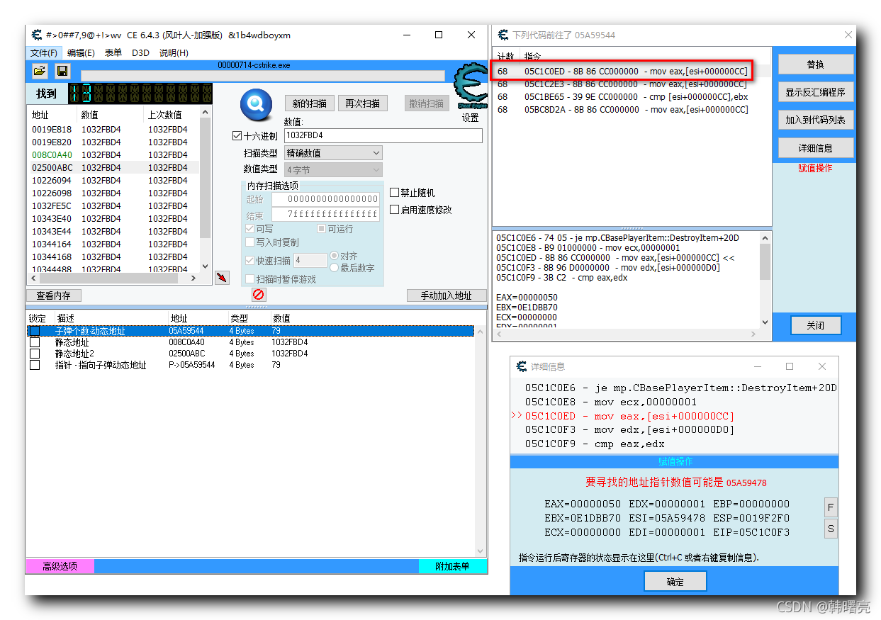 首先 , 查找到子弹数据的 动态地址 05A59544 , 该步骤很容易 , 多次扫描内存 , 最后使用二分法 , 逐步找到最终的内存地址 ;