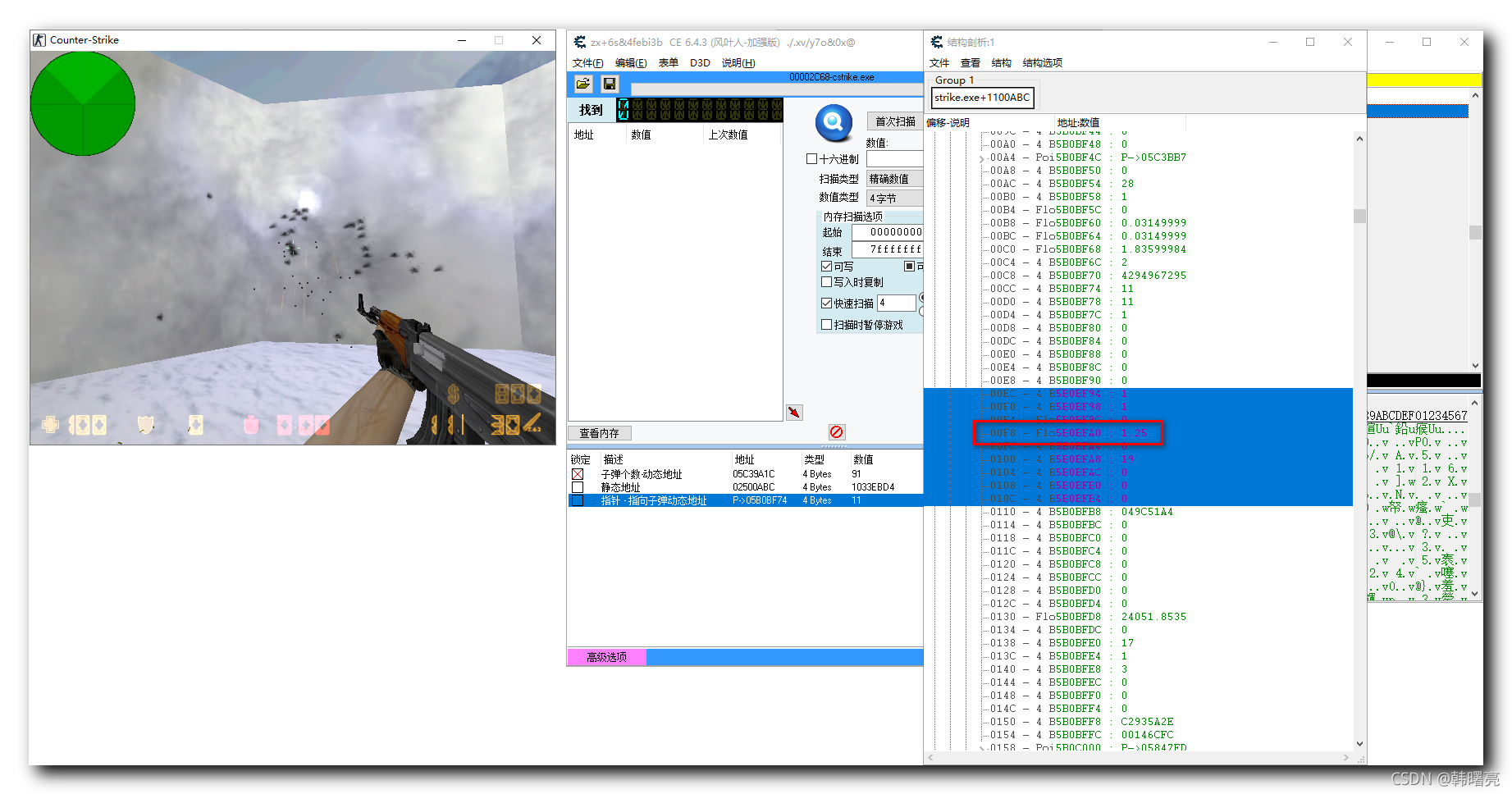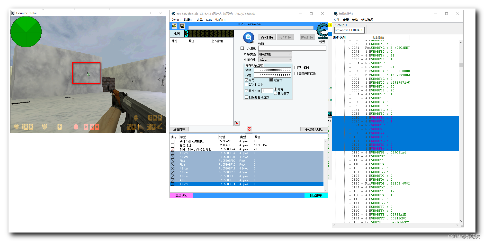 这批地址就是与后坐力相关的数据内存地址 , 锁定这些数据 , 就可以造成无后坐力效果 ;