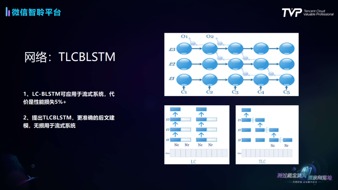 首先是TLCBLSTM网络。LSTM网络结构的主要形式有两种,一种是单向,一种是双向。一般情况下,双向LSTM性能比单向的要高出10%左右,但双向LSTM却有着无法用在流式场景下的局限。TLCBLSTM就是一种既可以把LSTM用在流式场景下,同时又能保持双向10%性能优势的解决方案。