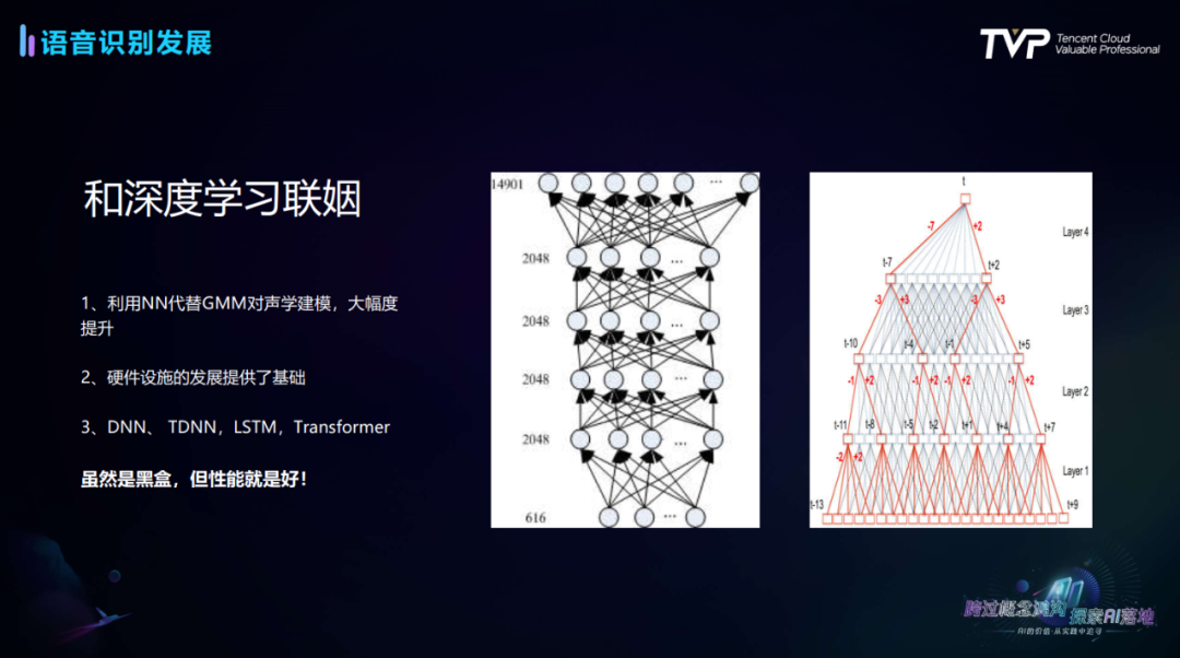 2009年以后,语音识别技术迎来了一次较大的发展。业界主流的观点认为这是因为语音识别技术搭上了深度学习发展的快车,卢鲤老师表示这是其中一个重要原因,但不是唯一原因。这个过程中,GPU等硬件设施的发展提供了基础,互联网尤其移动互联网的飞速发展带来更多的场景,使得语音识别技术从实验室到广泛民用市场。