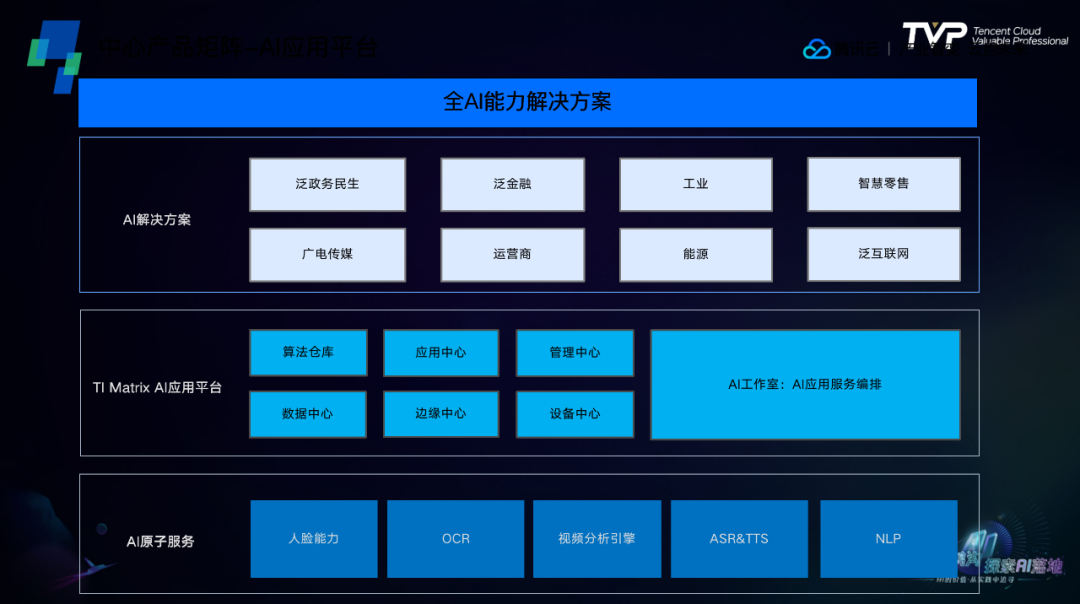 在企业客户的落地过程中,腾讯云观察到客户的需求非常全面,除了对语音语义能力的使用以外,还会用到其他相关能力进行结合。腾讯云也提出了一套全AI能力解决方案,在底层会结合包括人脸、车辆、物体识别、图像AI识别、OCR、生物分析、NLP等全AI能力,基于Ti Matrix云智天枢AI应用平台,深入广泛的行业,打造泛政务民生、泛金融、工业、智慧零售、广电传媒、运营商等AI解决方案。