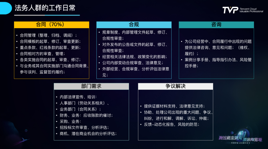 刘谦老师向与会者介绍了法务人群的工作日常,这个场景下从业人员的工作一般分为合同、合规、咨询、部门需求、争议解决五大类别,这其中又以合同占比最大,一般达到日常工作的70%左右。