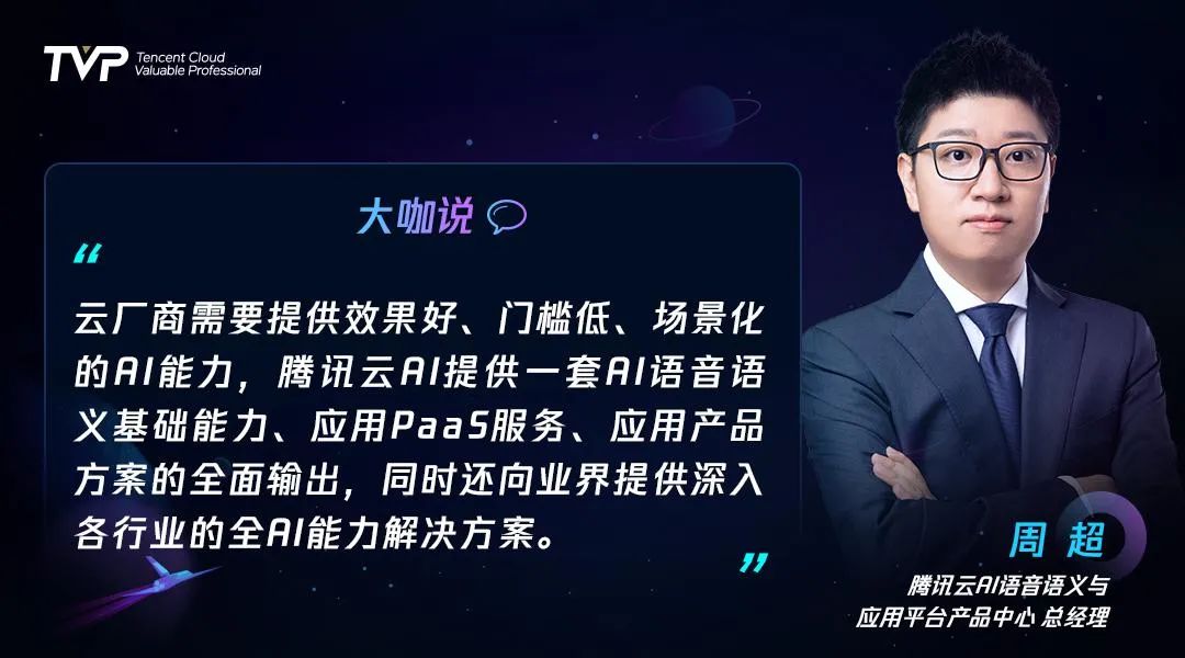 周超:腾讯云AI帮助各类企业做业务的落地,首先关注的是AI入场以后可以帮助企业降低成本,第二关注AI的替换可以提高企业效率,第三这个替换本身就是具备创新性的。在这个原则判断下,目前腾讯云的AI已经在多个行业,包括医疗、教育、政务、文旅、金融、能源等行业企业中深度落地。腾讯云所提供的全AI能力的解决方案都是可以做一个应用和落地去改善行业、企业的业务流程。在这个过程中腾讯云不会做到面面俱到,而是会以提供开放的基础能力以及与合作伙伴深度共建的方式共同探索。