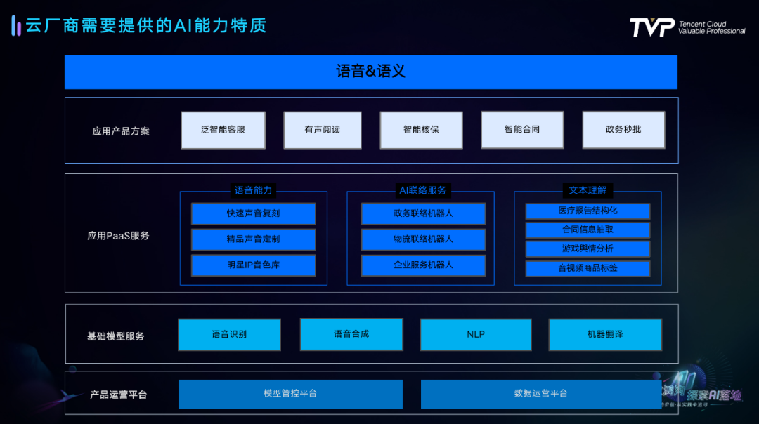 目前腾讯云AI语音语义产品架构从基础层到产品方案层分为:产品运营平台、基础模型服务、应用Paas服务和应用产品方案四个部分。在每个产品方向上,腾讯云AI都提供了详尽的AI能力,企业可以基于自己的业务场景,选择基础模型服务、应用PaaS服务、应用产品方案等不同层次的产品,降低企业应用AI能力的门槛。