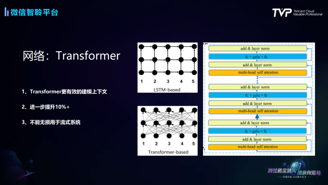 在LSTM以外,微信智聆平台还实现了Transformer的网络结构。目前该系统的开发正在有序进行中,卢鲤老师指出这种Transformer的结构可以有效利用运行的并行性,无损地应用在流式系统中。