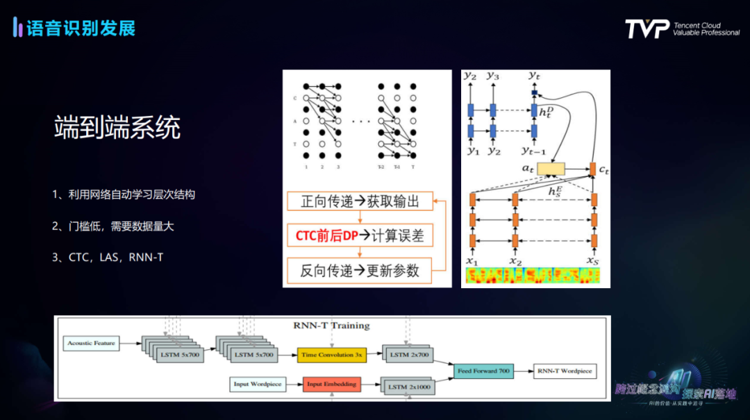 在语音识别技术的发展过程中,卢鲤老师重点介绍了DNN、TDNN、LSTM以及Transformer等模型的发展以及对性能带来的提升。从2014年以后,部分科学家开始在Hybrid系统以外尝试端到端的系统,相比前者,该系统输入语音,输出的就变成了文字。