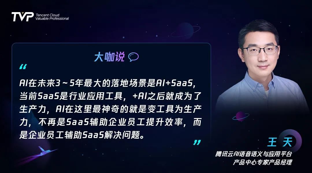 在圆桌讨论环节,几位嘉宾还就AI创业方向选择、学术研究方向等议题做了精彩的论述。本场闭门会主持人腾讯云AI语音语义与应用平台产品中心专家产品经理王天也给出了自己对AI落地的未来趋势判断: