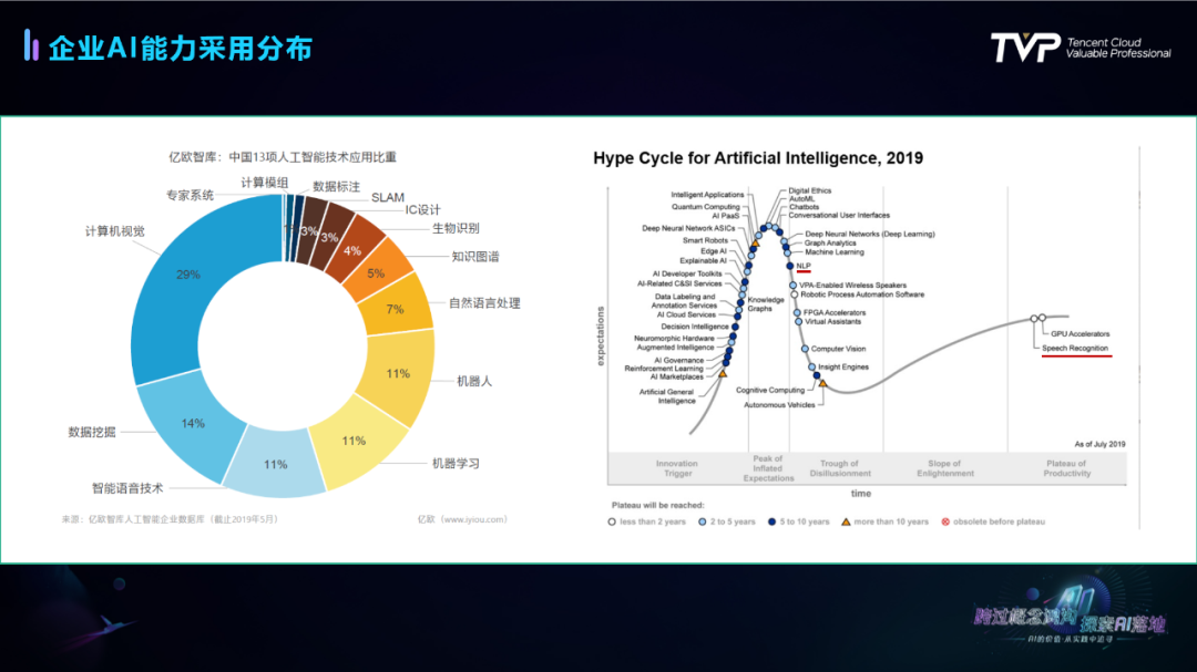 根据目前业界对企业AI能力需求的调查报告显示,计算机视觉目前是最受关注的企业AI能力,紧随其后的就是智能语音技术、自然语言处理技术的份额。在对AI技术趋势发展做分类,从技术的触发期、期望膨胀期、泡沫破灭期、启蒙爬升期、再到高原期的曲线可以很清晰地看出各AI技术所处的发展位置。