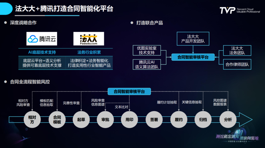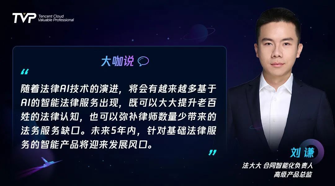 刘谦:法大大在做AI产品落地的过程中,首先考虑的产品规划就是围绕合同展开的,在想明白这个产品逻辑和实际痛点以后延伸开去,发现用户的需求又不断处于变化中,从简单的电子合同签署到管理诉求再到分析诉求,这样反过来也给我们的产品发展规划带来了益处,因为我们找到了真实的客户价值所在。和腾讯云的合作给了我们非常强的模型调优能力和数据处理的准确性,大大提升了产品效果,客户也十分信任。这对法务、业务和公司都是一个多方共赢的局面。