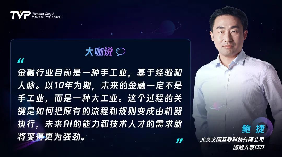 鲍捷:人工智能已经有过多次高潮和低谷,我最早接触人工智能是在1998年,当时是针对医疗影像的应用。后来也在法务、国防等领域有过从业经历,可以说人工智能传统四大领域的医疗、法务、政府、金融我都有过涉及。我个人目前在做金融方向的AI应用,也非常看好金融这个领域。在人工智能的各个落地方向上,其实有一些共同的特性,核心就是三个方面:一个是数据必须有边界,第二个是业务必须有边界,第三个是一旦出错是否会导致不可逆的后果。因此在人工智能落地的方向上也可以按照这几个维度去套用检测,L5级别的自动驾驶在我看来就不是一个值得追求的方向,因为它的三大要素都不具备。但在金融、医疗、工业、政务等方向却是值得探索的,我个人认为目前凡是跟流程自动化有关的工作,其实都是值得去探索的方向,这是我的考虑。