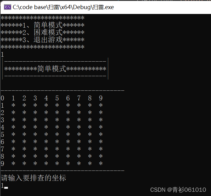 这里是利用for循环,打印一排数字,然后打印一排数组元素之后就换行,然后每行开头会打印列数,方便排雷时选取坐标。
