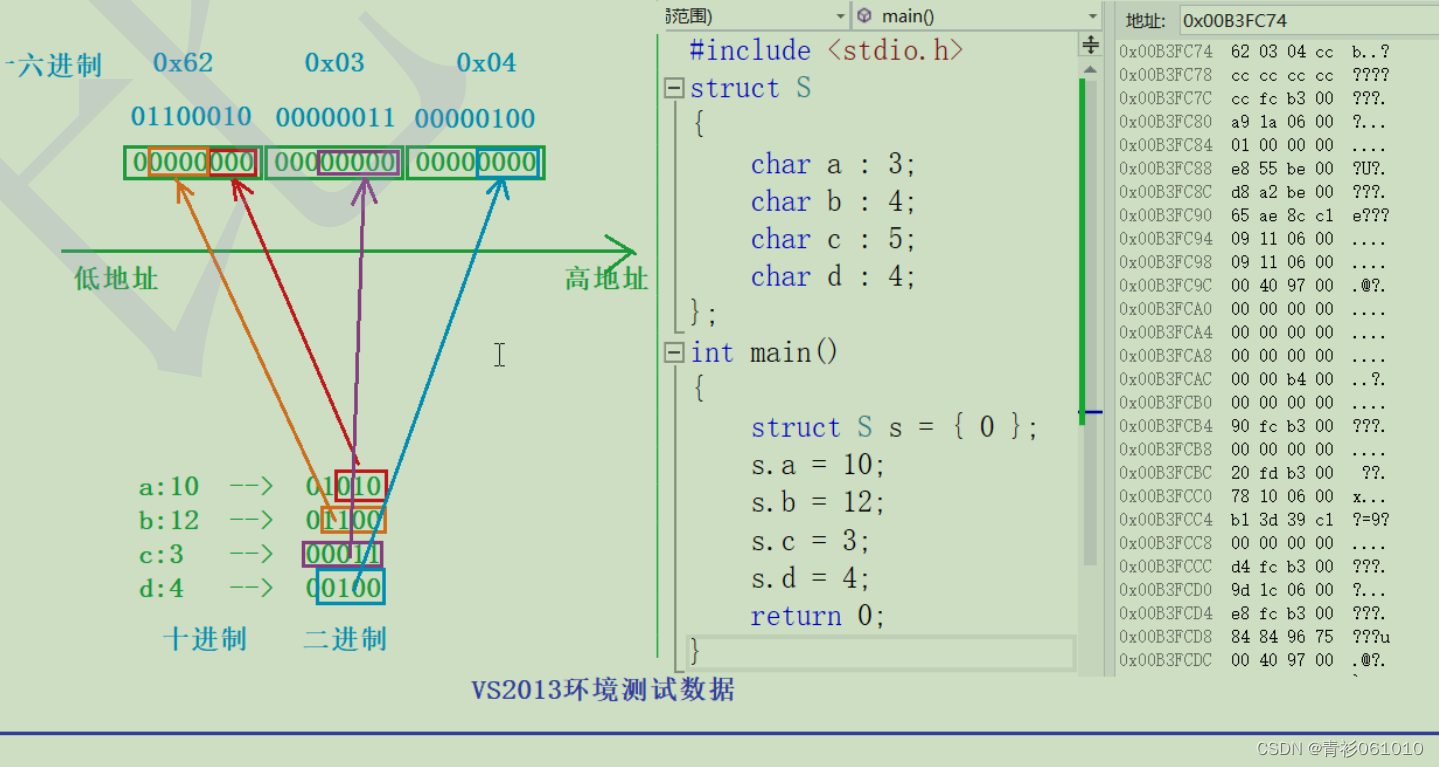我们可以知道,10转化为二进制的代码是1010,可是 只能用3个比特位,所以取出010来存储,12二进制是1100,取用四个比特位,全部放进去,而存储的时候是四个。存储时,四个二进制为是一个十六进制位。按照这样计算,得到的数字是6、2、3、4。所以地址中的存储是,620304,也验证了我们的猜想,而且我们也可以知道,位段在一个字节中浪费的位置,下一个变量如果不够的话不会继续使用,而是开辟新的字节并在其中存储。