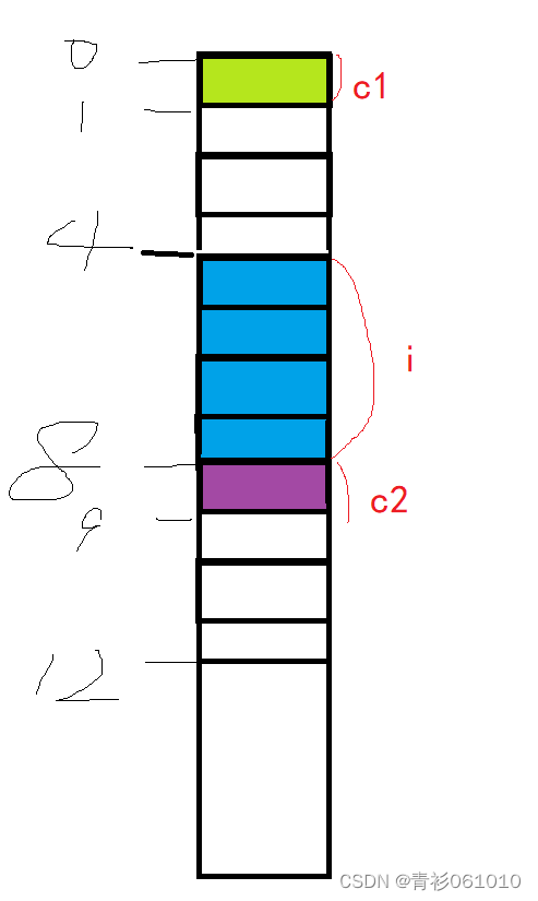 🎄🎄 第一个成员变量从地址0处开始,vs中默认的对齐数是8,char类型大小是1,选择其中较小值作为对齐数,所以是1。而int类型的i的对齐数是4(类型大小或者默认对齐数的较小值),要对齐到对齐数的整数倍开始,也就是从4开始存储了,也就是最后存储完对齐的地址是8,char同理算得对齐数是1,所以对齐到地址9地方。然后结构体总大小要是最大对齐数的倍数,也就是要是4的倍数,所以自动增到12为止。