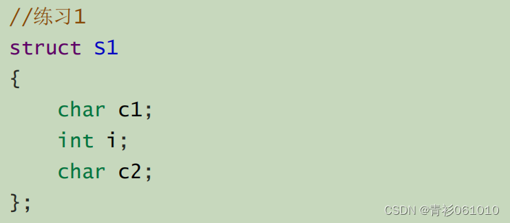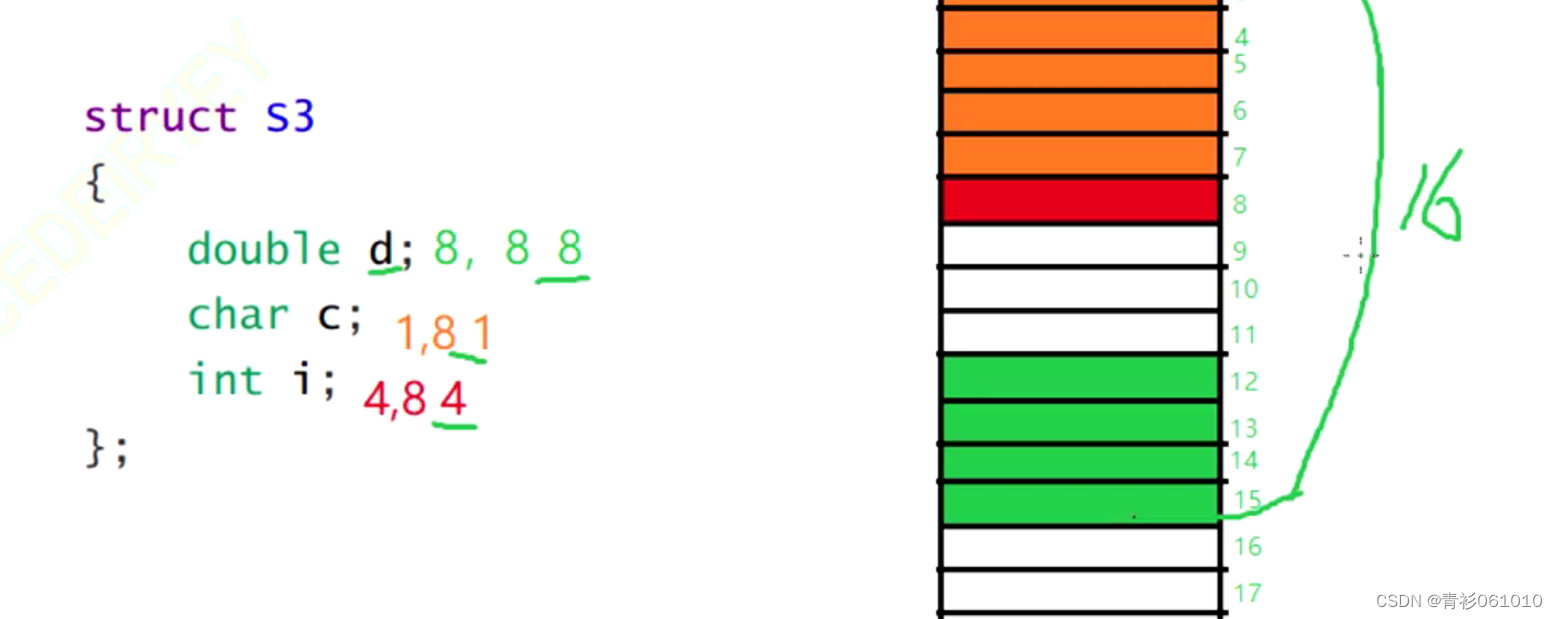 例题2算得16. 🎄🎄第一个double对齐数算得是8,所以占用内存0~7总共八个字节,第二个char类型对齐数是1,占用第八个字节, 最后一个int从12开始占用12-15四个字节,因为对齐原则,最终要对齐到最大的对齐数8的倍数,所以是16个字节。