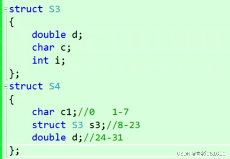 由这句话可以知道s3的对齐数是8,对齐大小是16个字节。 🎄🎄c1对齐第一个字节,然后s3对齐到8开始占用,占用8~23这16个字节,d的对齐数是8,从24开始占用8个字节大小。最终占用0~31这32个字节。