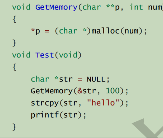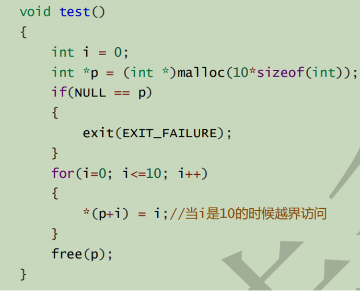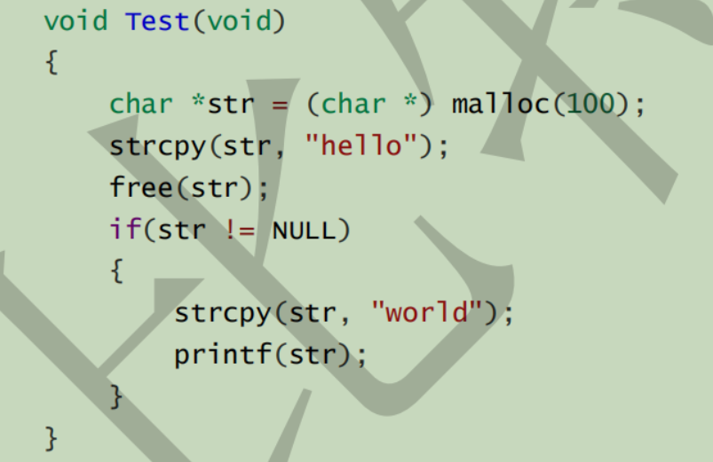 使用malloc之后就应该判断是否为NULL。 并且free再次使用了这块空间,造成了越界访问。