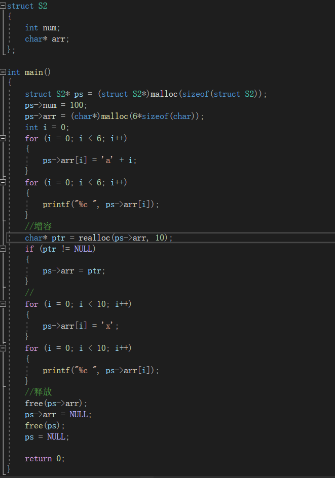 第二种方式开辟随意大小空间的数组,这种的方法要用两次malloc,两次free。可以看出,这种方法明显没有第一种柔性数组的好用。